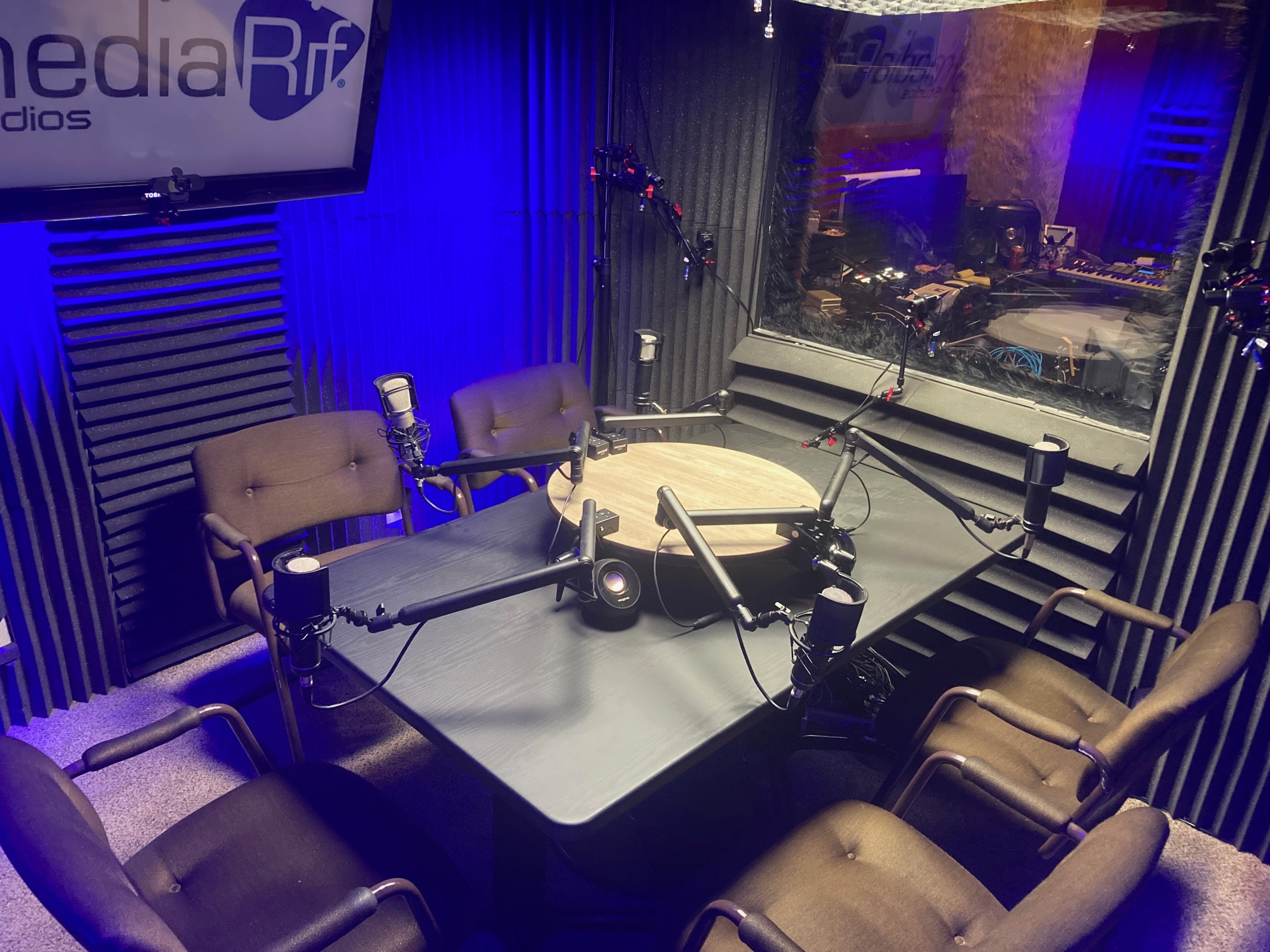 - 6 seat podcast desk (pre-mounted microphones)