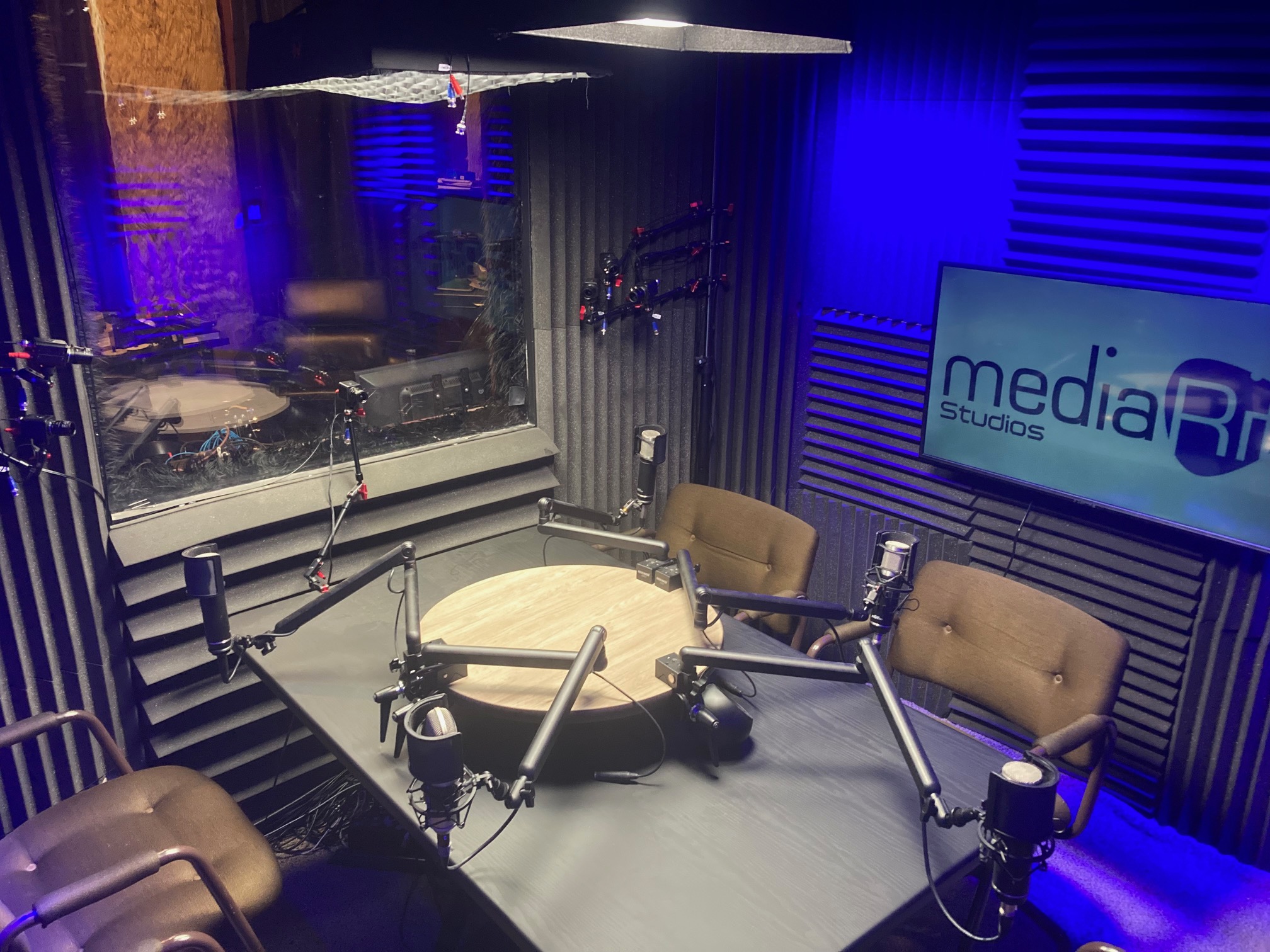 - 6 seat podcast desk (pre-mounted microphones)